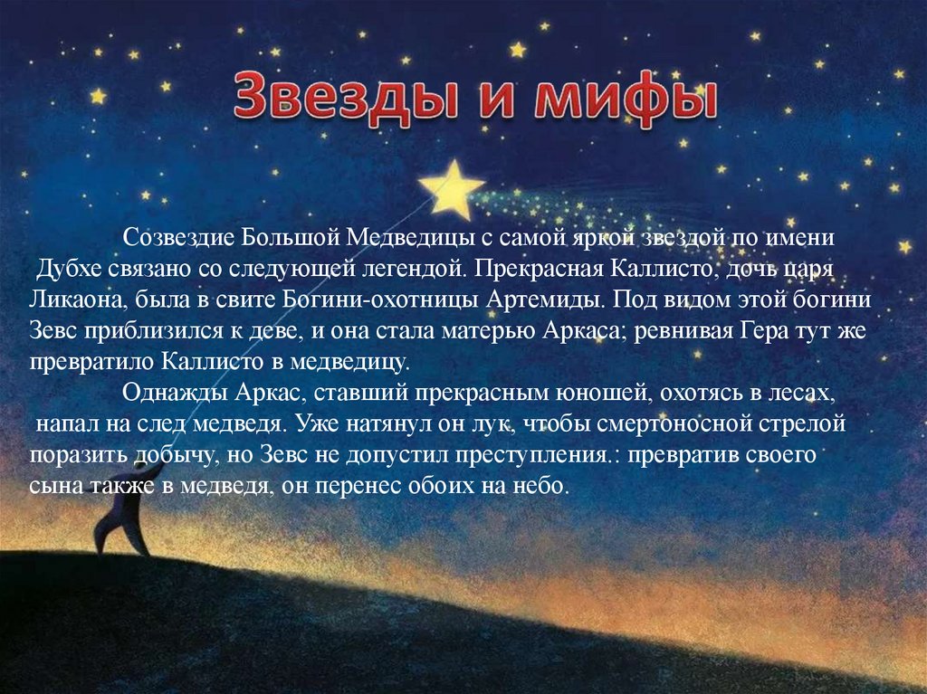 Созвездие Большой Медведицы с самой яркой звездой по имениДубхе связано со следующей легендой. Прекрасная Каллисто, дочь царя