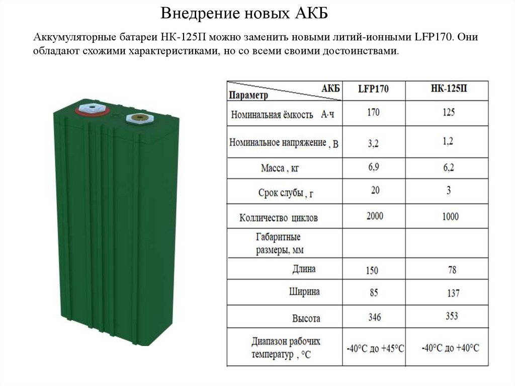 Внедрение новых АКБАккумуляторные батареи НК-125П можно заменить новыми литий-ионными LFP170. Они
