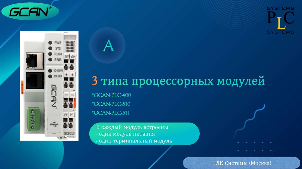 ПЛК GCAN с остоит из одного процес с орного модуля (в него встроен один сил овой модул ь ) ,нес к ол ьк и х мод ул е й в вод а -в ы вод а и од ного терминал ь но го мод ул я