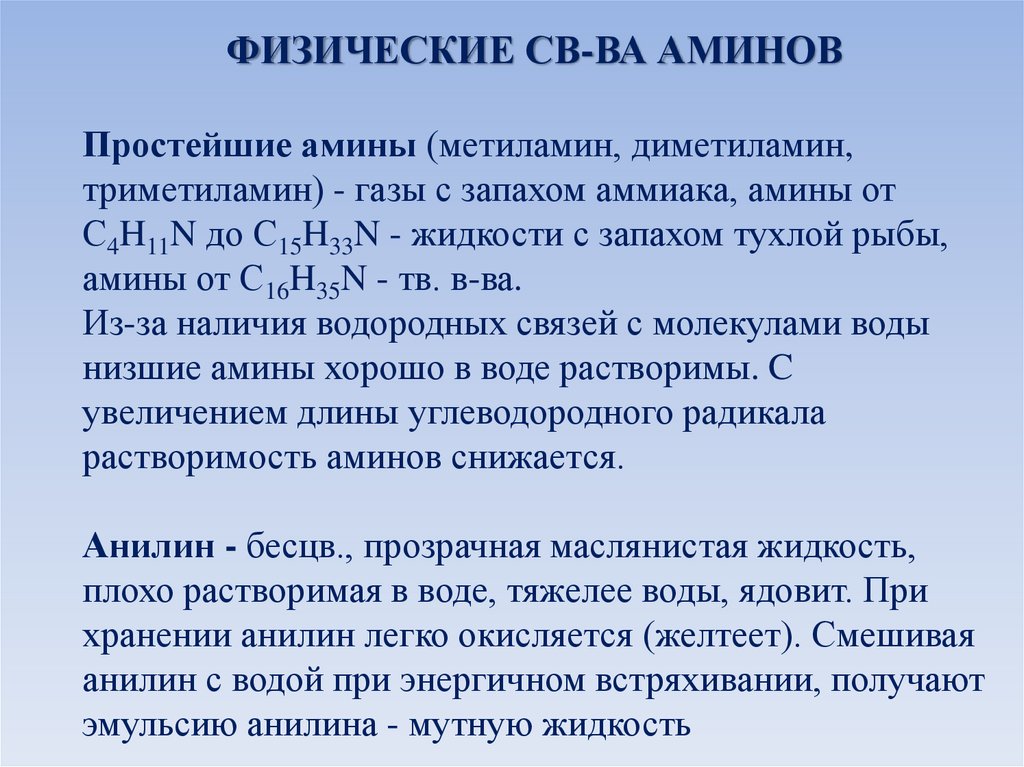 С4H11N до С15H33N - жидкости с запахом тухлой рыбы,