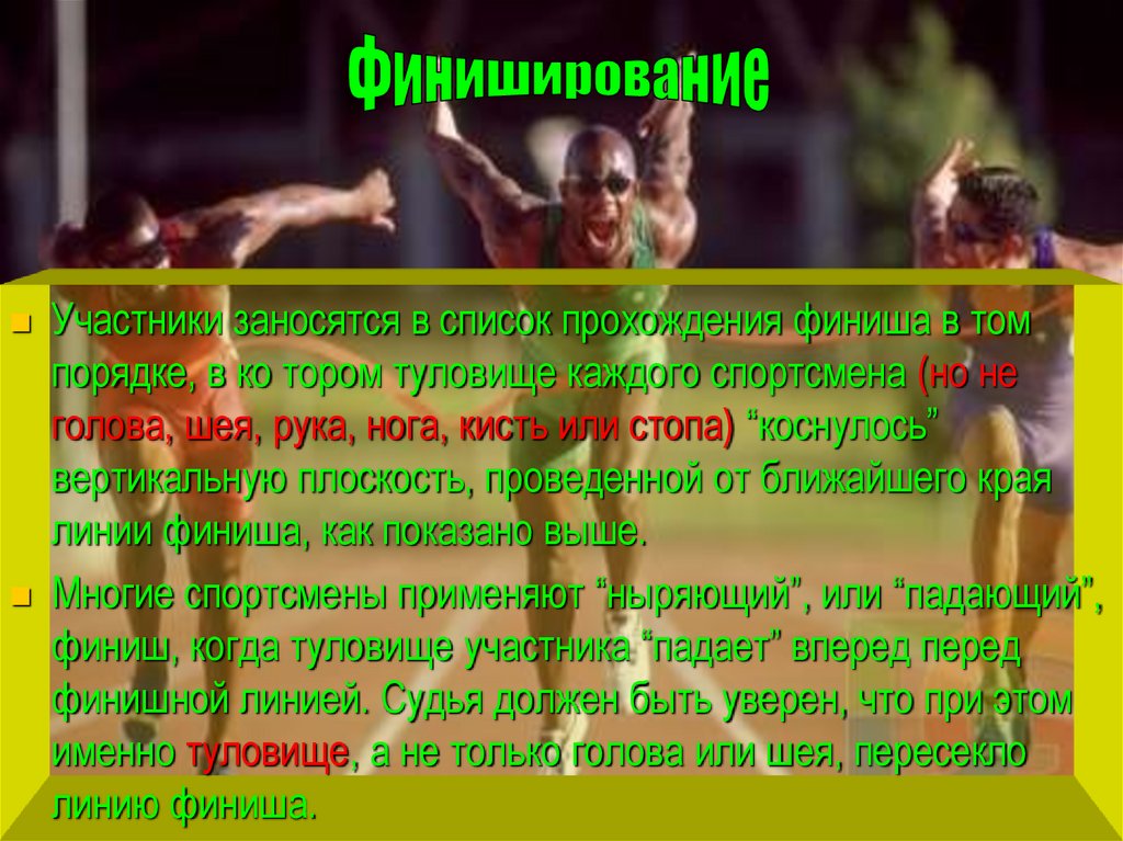 финиш, когда туловище участника “падает” вперед перед
