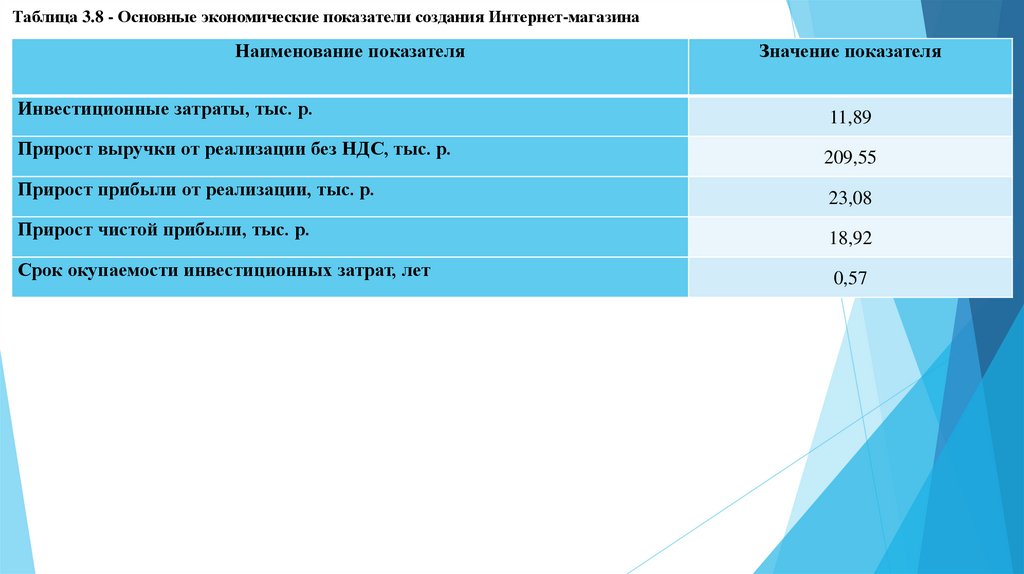 Таблица 3.8 - Основные экономические показатели создания Интернет-магазинаНаименование показателя