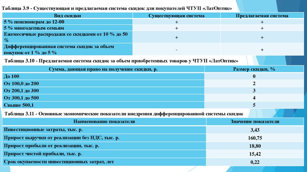 Таблица 3.9 - Существующая и предлагаемая система скидок для покупателей ЧТУП «ЛатОптик»Вид скидки