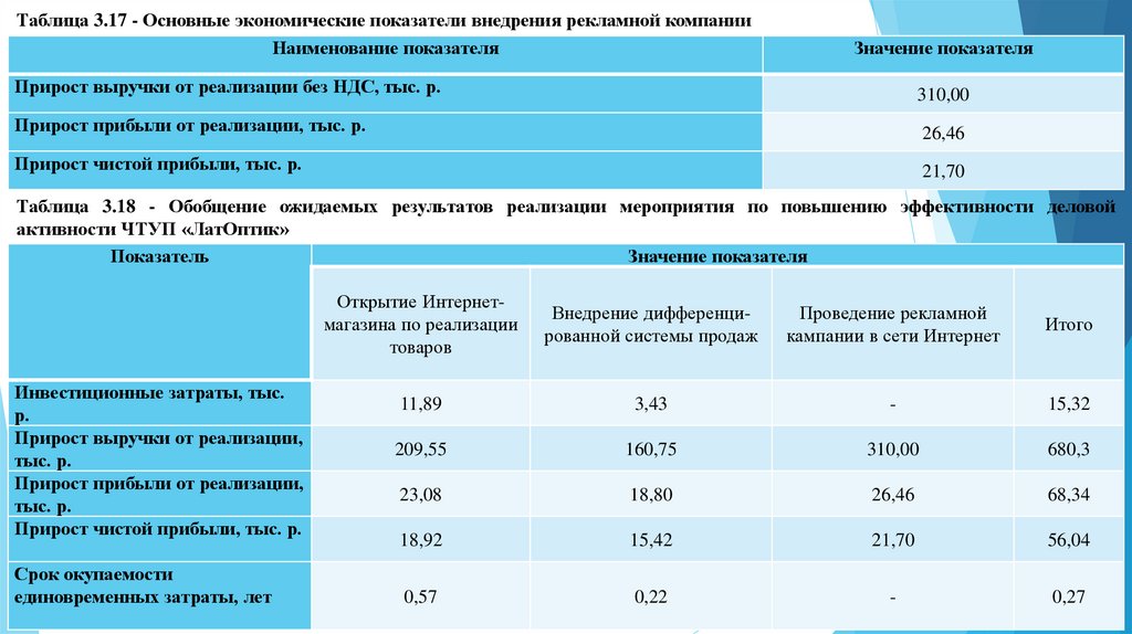 Таблица 3.17 - Основные экономические показатели внедрения рекламной компанииНаименование показателя