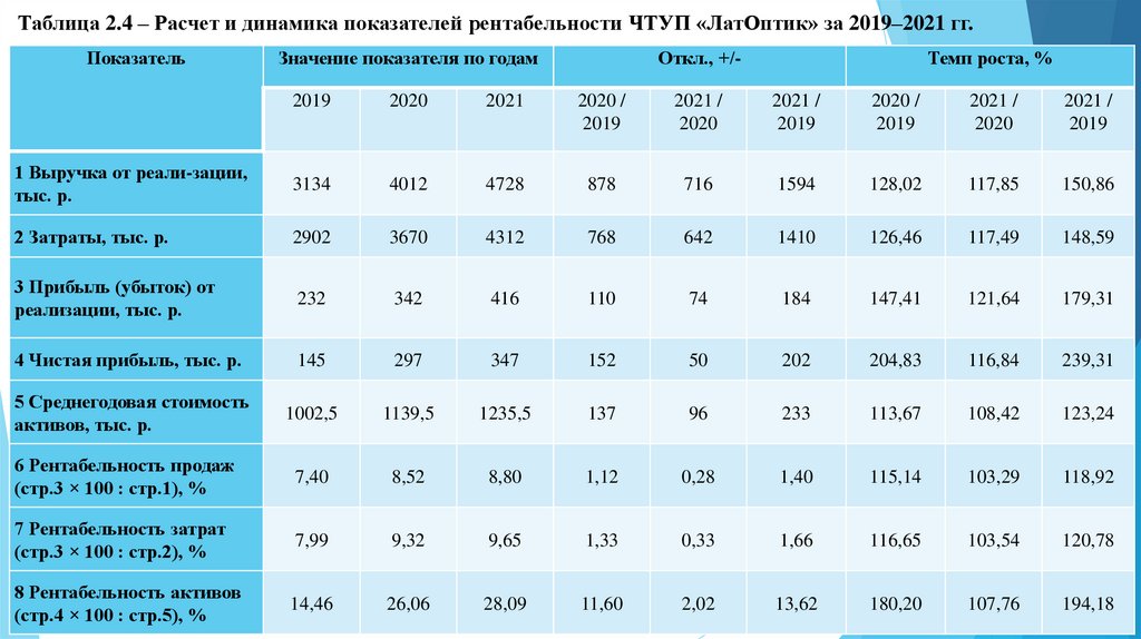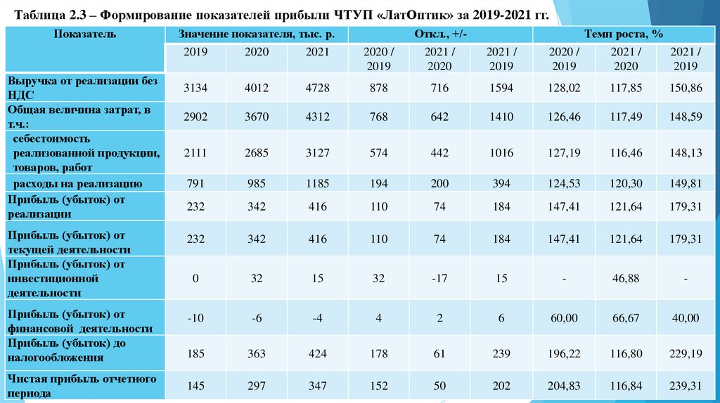 Таблица 2.3 – Формирование показателей прибыли ЧТУП «ЛатОптик» за 2019-2021 гг.Показатель