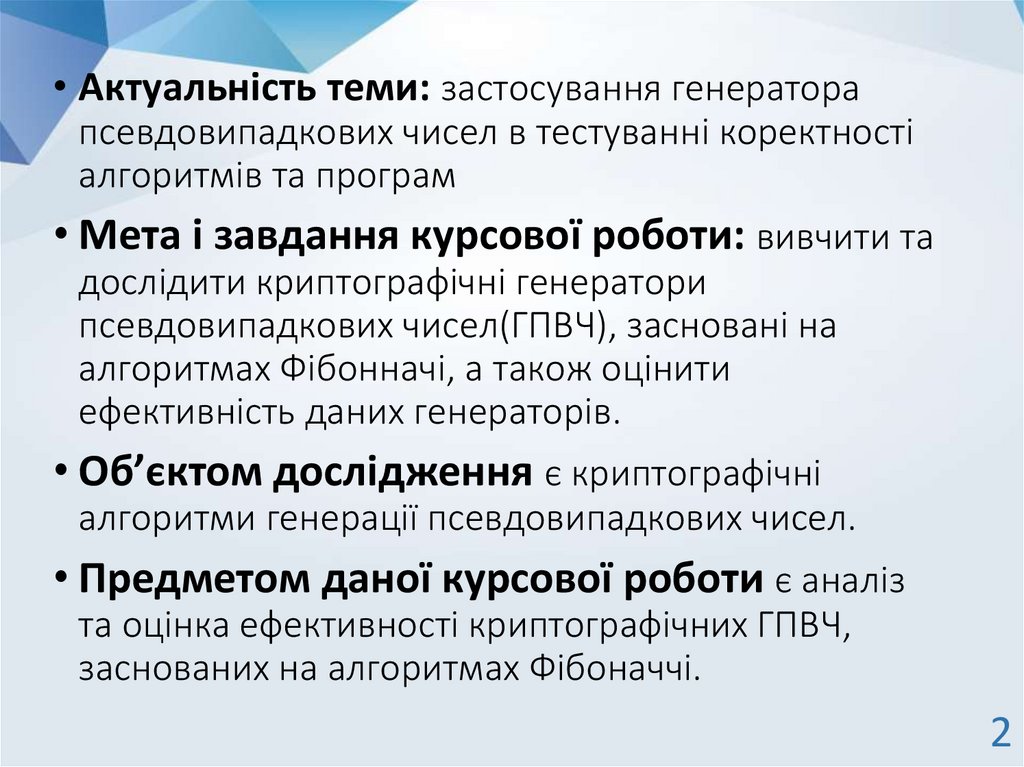 • Актуальність теми: застосування генераторапсевдовипадкових чисел в тестуванні коректності