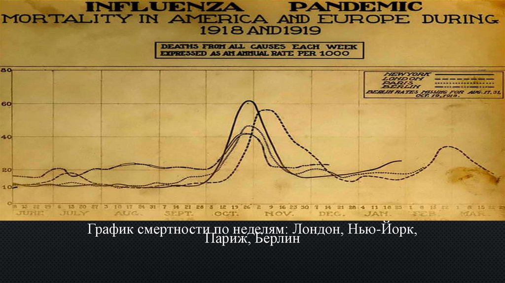 График смертности по неделям: Лондон, Нью-Йорк,Париж, Берлин