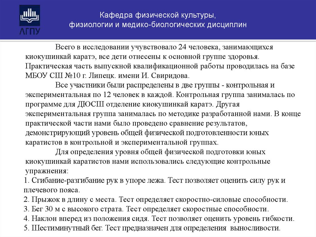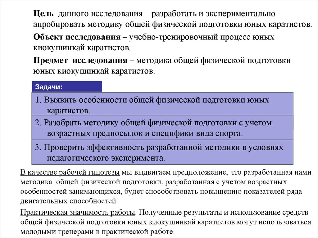 Цель данного исследования – разработать и экспериментальноапробировать методику общей физической подготовки юных каратистов.