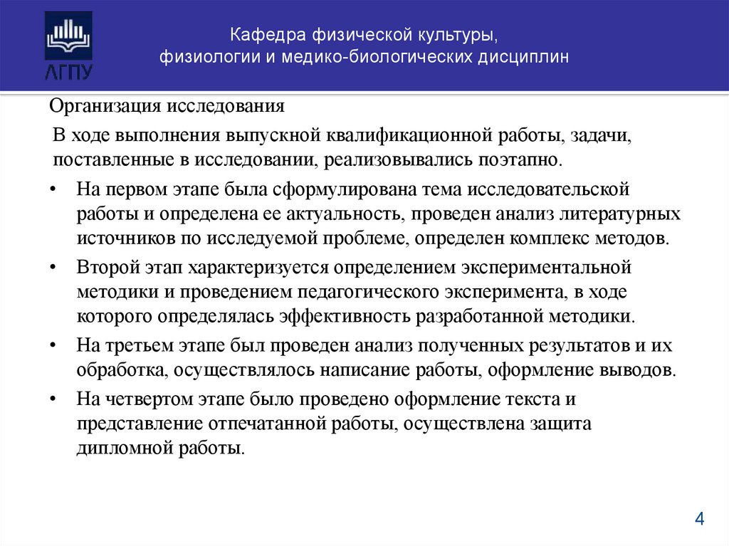 поставленные в исследовании, реализовывались поэтапно.