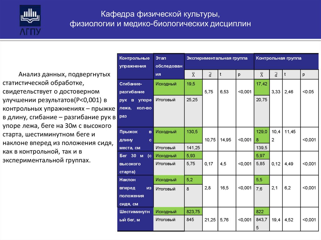 Увеличение показателей мы наблюдаем в обеихгруппах, но степень достоверности среднего прироста выше в экспериментальной группе (Р ˂