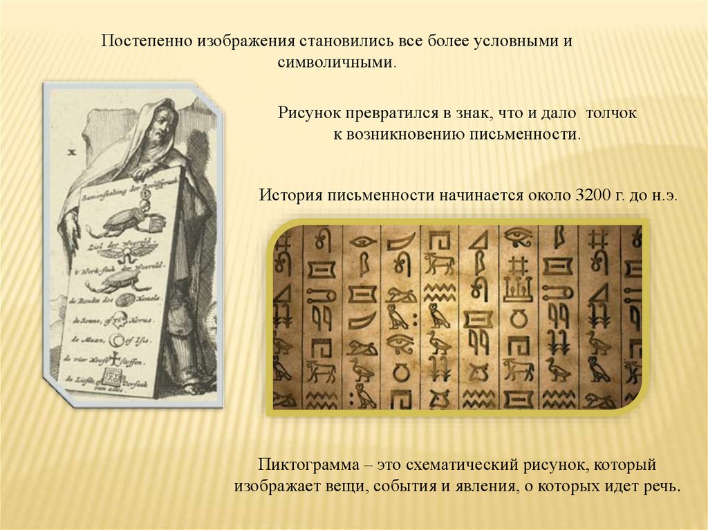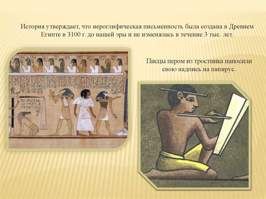История утверждает, что иероглифическая письменность была создана в ДревнемЕгипте в 3100 г. до нашей эры и не изменялась в течение 3 тыс. лет.