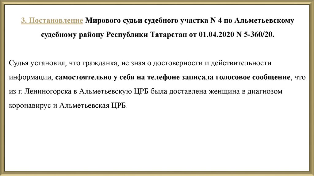 3. Постановление Мирового судьи судебного участка N 4 по Альметьевскомусудебному району Республики Татарстан от 01.04.2020 N 5-360/20.