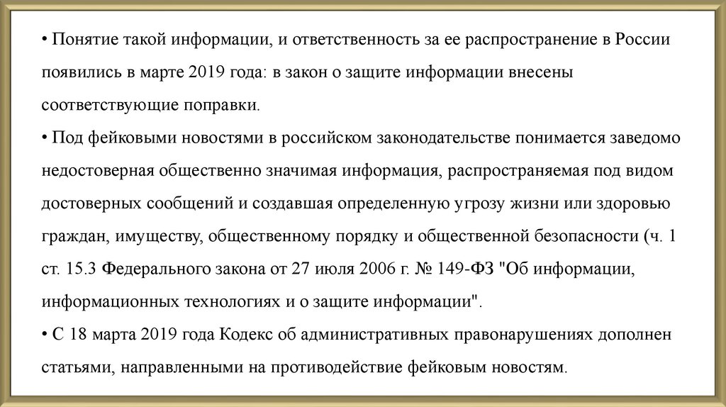 • Понятие такой информации, и ответственность за ее распространение в Россиипоявились в марте 2019 года: в закон о защите информации внесены