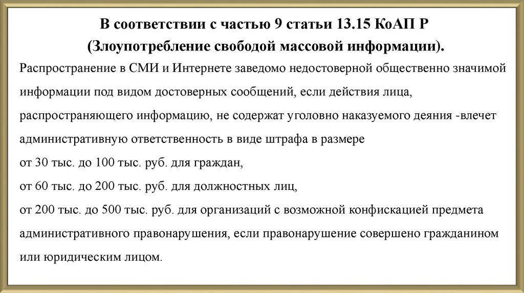 В соответствии с частью 9 статьи 13.15 КоАП Р(Злоупотребление свободой массовой информации).