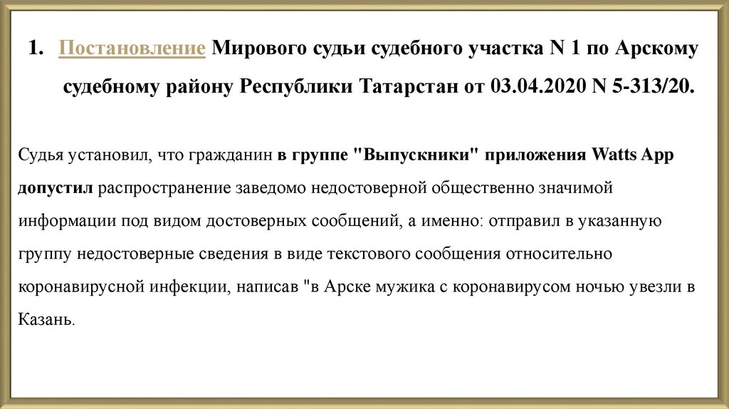 1. Постановление Мирового судьи судебного участка N 1 по Арскомусудебному району Республики Татарстан от 03.04.2020 N 5-313/20.