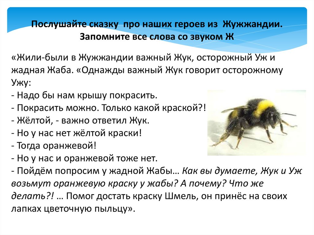 Послушайте сказку про наших героев из Жужжандии.Запомните все слова со звуком Ж