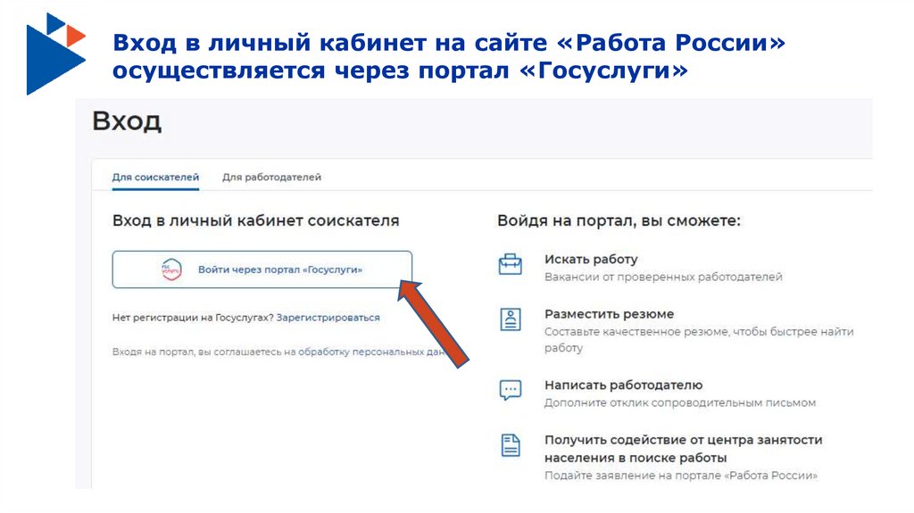 Вход в личный кабинет на сайте «Работа России»осуществляется через портал «Госуслуги»