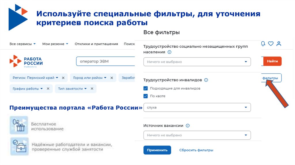 Используйте специальные фильтры, для уточнениякритериев поиска работы