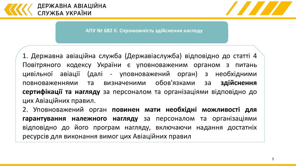 АПУ № 682 II. Спроможність здійснення нагляду1. Державна авіаційна служба (Державіаслужба) відповідно до статті 4