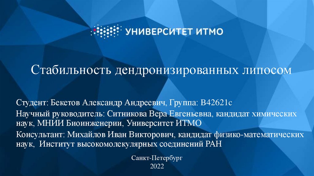 Стабильность дендронизированных липосомСтудент: Бекетов Александр Андреевич, Группа: B42621c