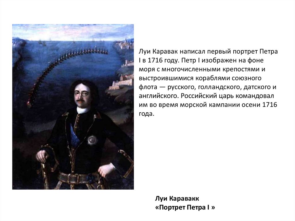 Луи Каравак написал первый портрет ПетраI в 1716 году. Петр I изображен на фоне
