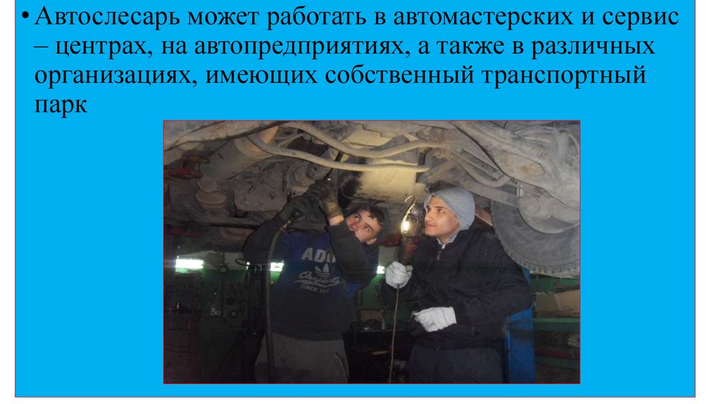 • Автослесарь может работать в автомастерских и сервис– центрах, на автопредприятиях, а также в различных