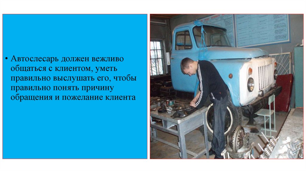 • Автослесарь должен вежливообщаться с клиентом, уметь
