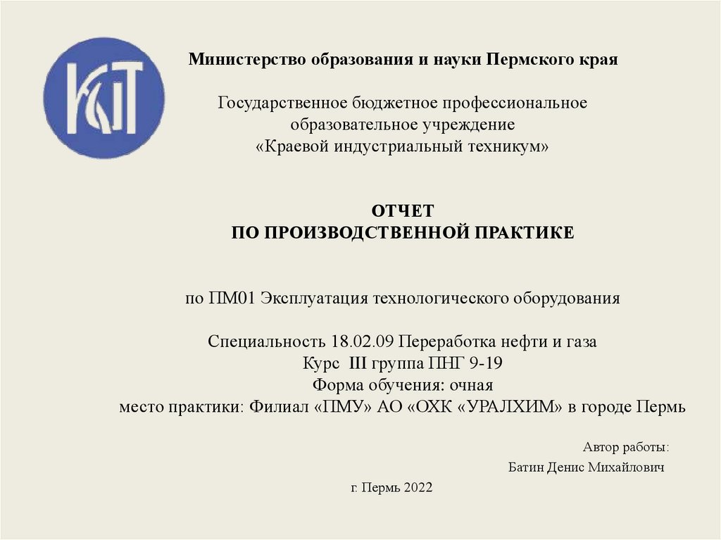 место практики: Филиал «ПМУ» АО «ОХК «УРАЛХИМ» в городе Пермь