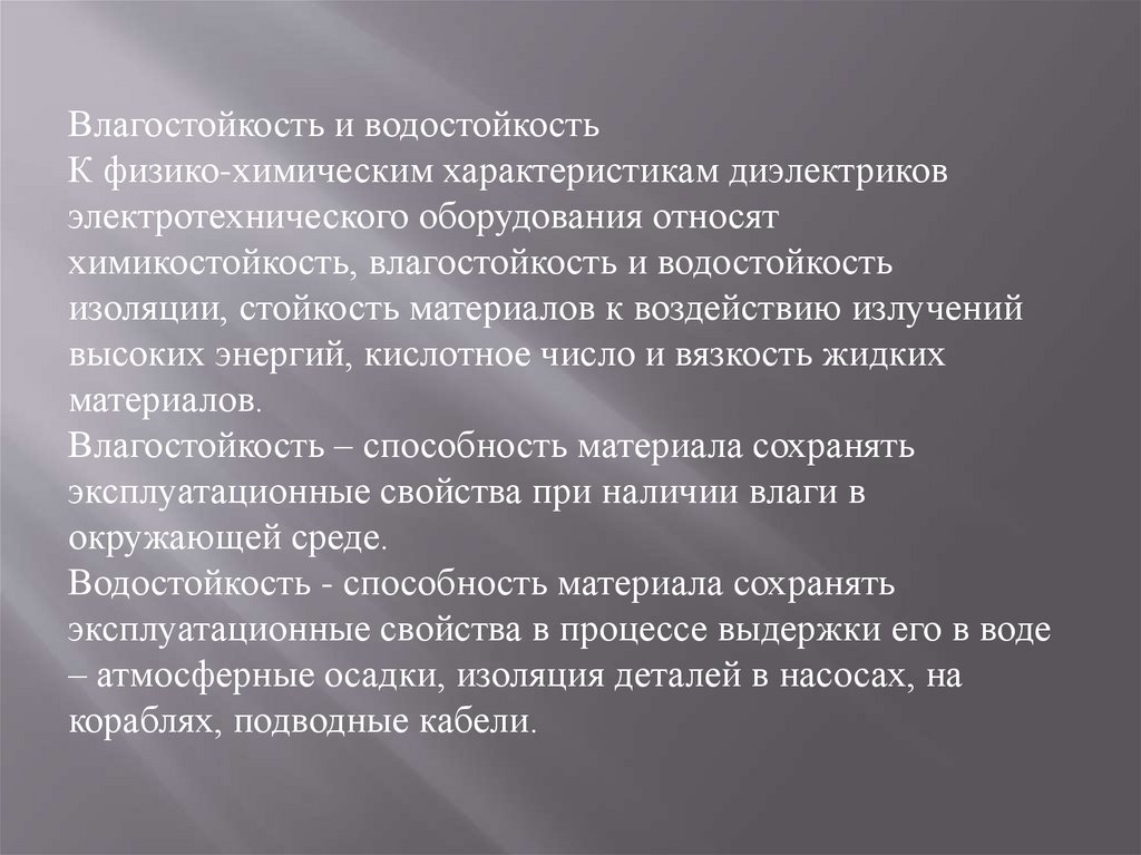 Влагостойкость и водостойкостьК физико-химическим характеристикам диэлектриков