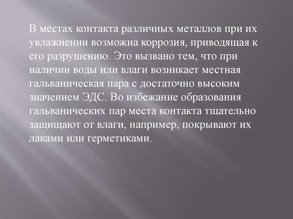 В местах контакта различных металлов при ихувлажнении возможна коррозия, приводящая к