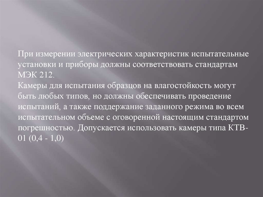 При измерении электрических характеристик испытательныеустановки и приборы должны соответствовать стандартам