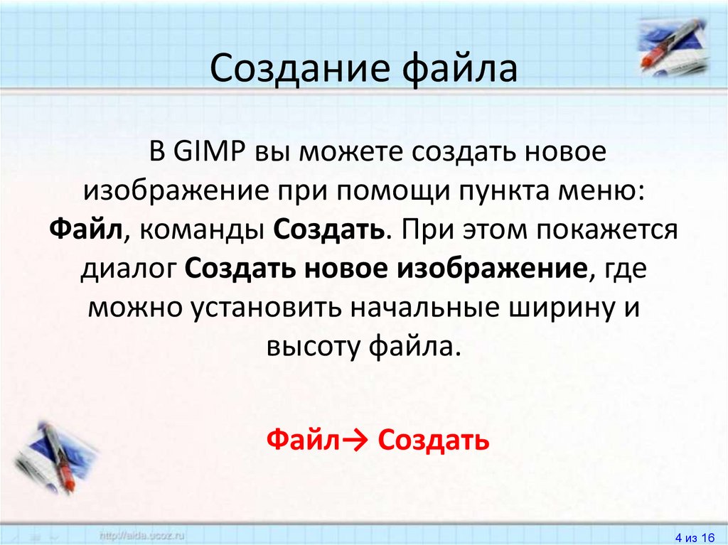 Создание файлаВ GIMP вы можете создать новое