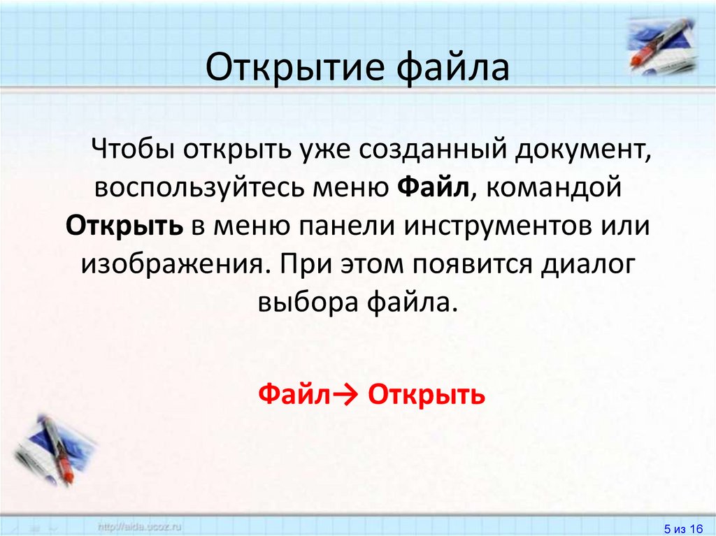 Открытие файлаЧтобы открыть уже созданный документ,