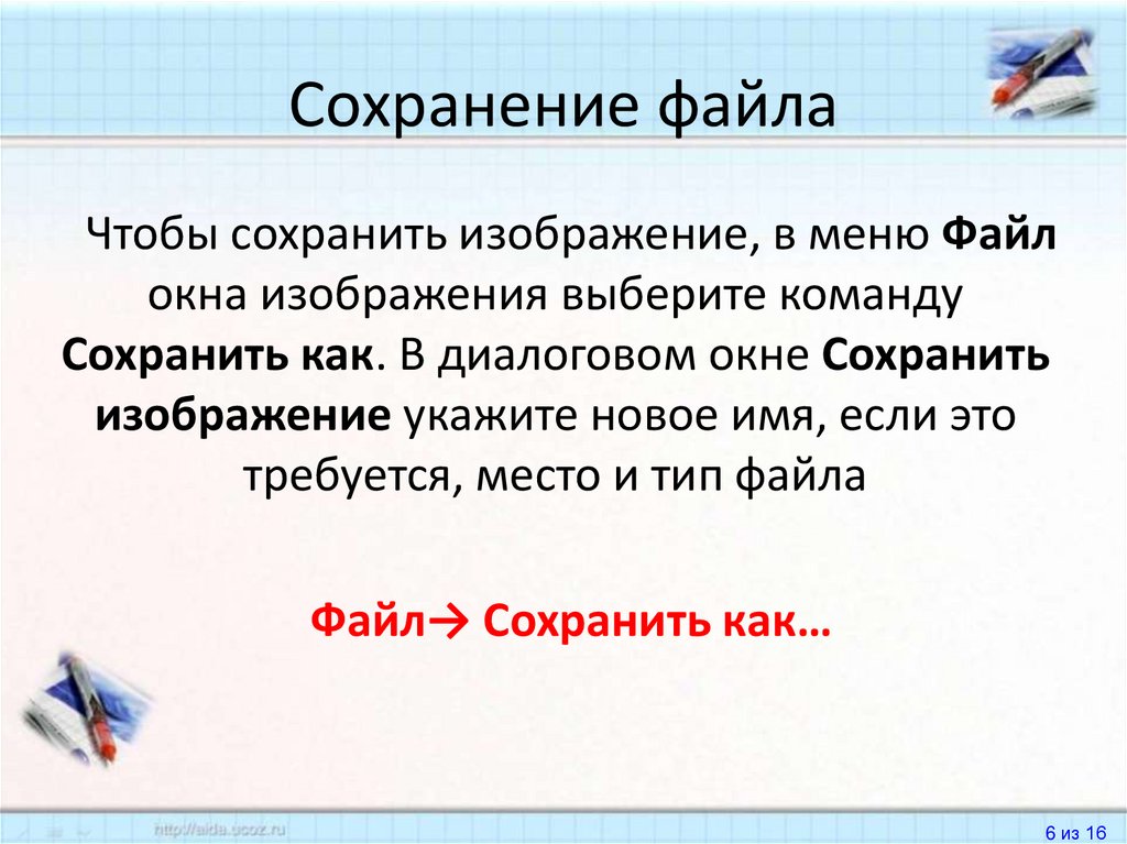 Сохранение файлаЧтобы сохранить изображение, в меню Файл