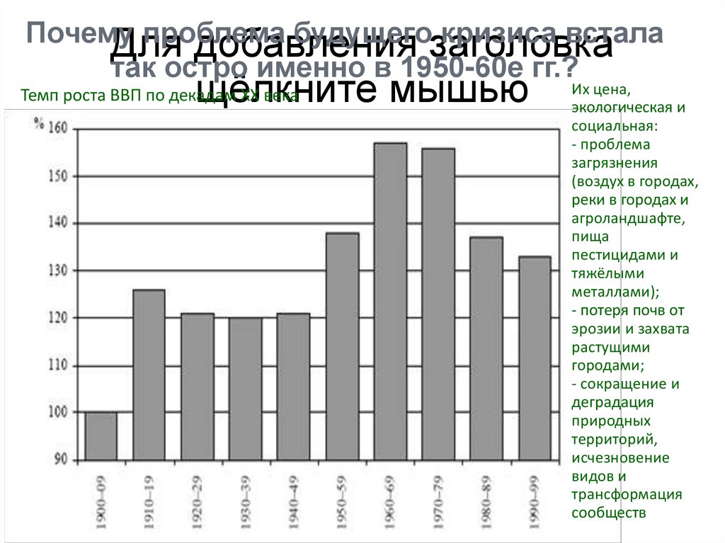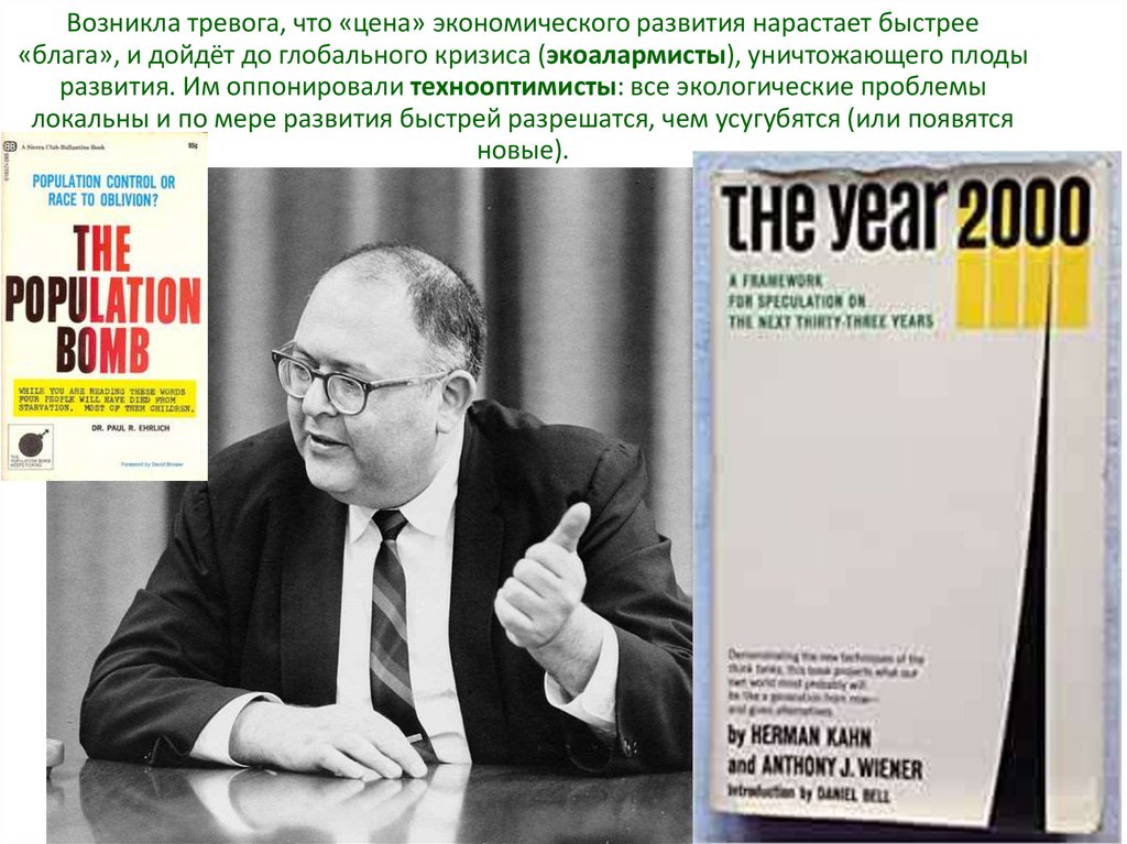 Возникла тревога, что «цена» экономического развития нарастает быстрее«блага», и дойдёт до глобального кризиса (экоалармисты), уничтожающего плоды