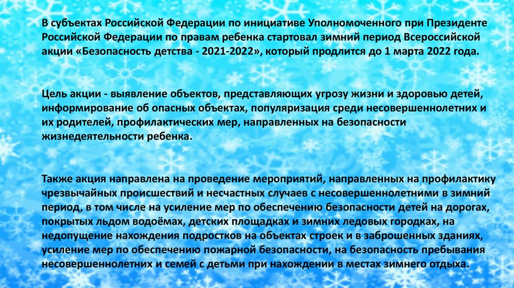 В субъектах Российской Федерации по инициативе Уполномоченного при ПрезидентеРоссийской Федерации по правам ребенка стартовал зимний период Всероссийской