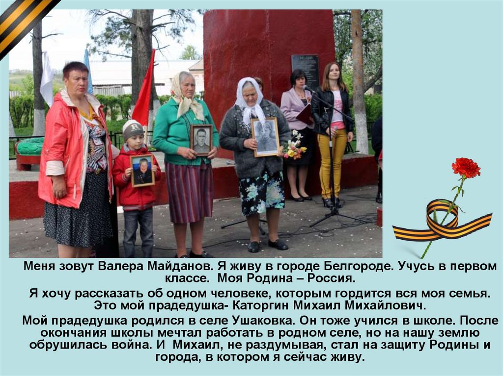 Меня зовут Валера Майданов. Я живу в городе Белгороде. Учусь в первомклассе. Моя Родина – Россия.