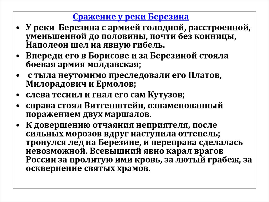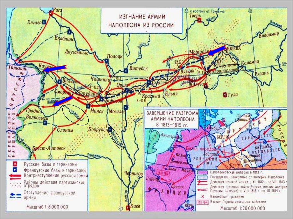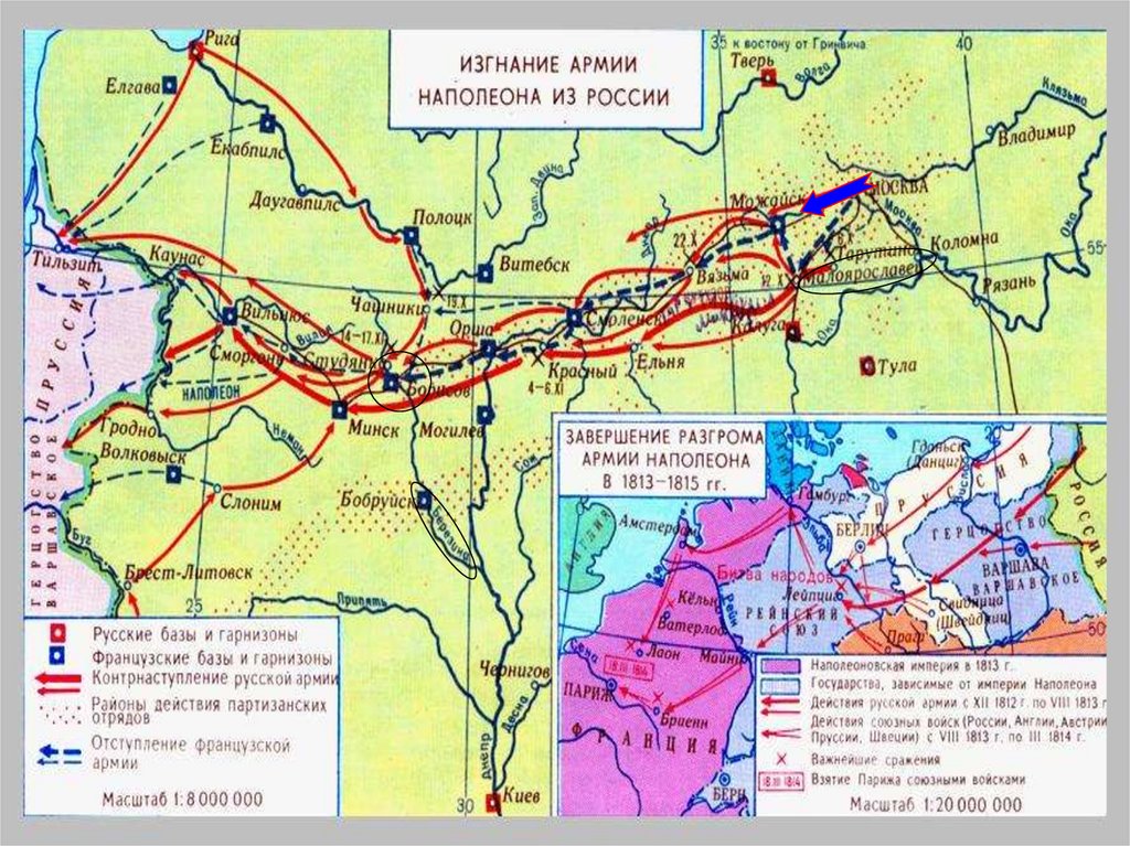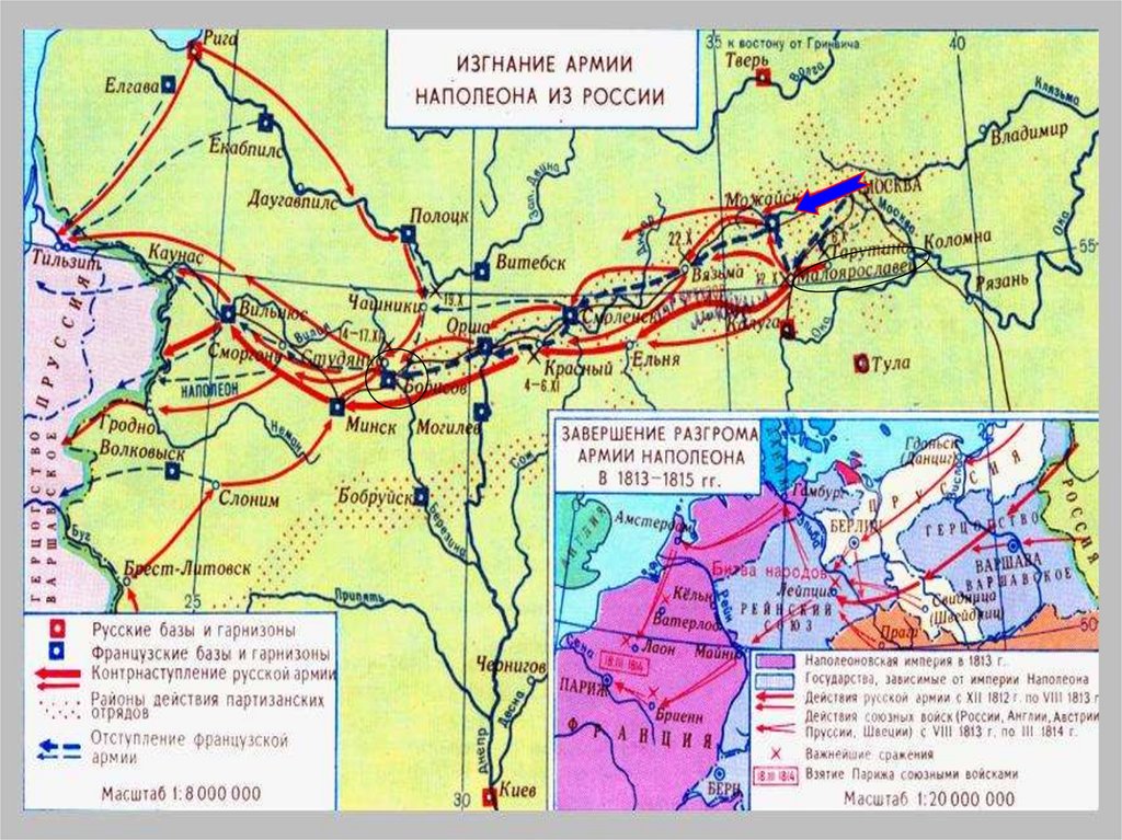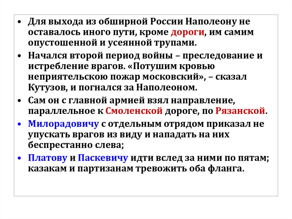 • Для выхода из обширной России Наполеону неоставалось иного пути, кроме дороги, им самим