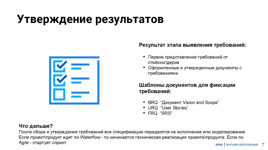 После сбора и утверждения требований все спецификации передаются на исполнение или моделирование.