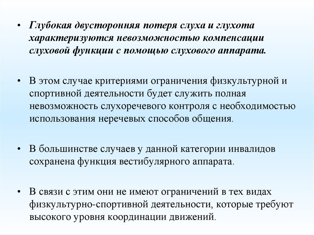 • Глубокая двусторонняя потеря слуха и глухотахарактеризуются невозможностью компенсации