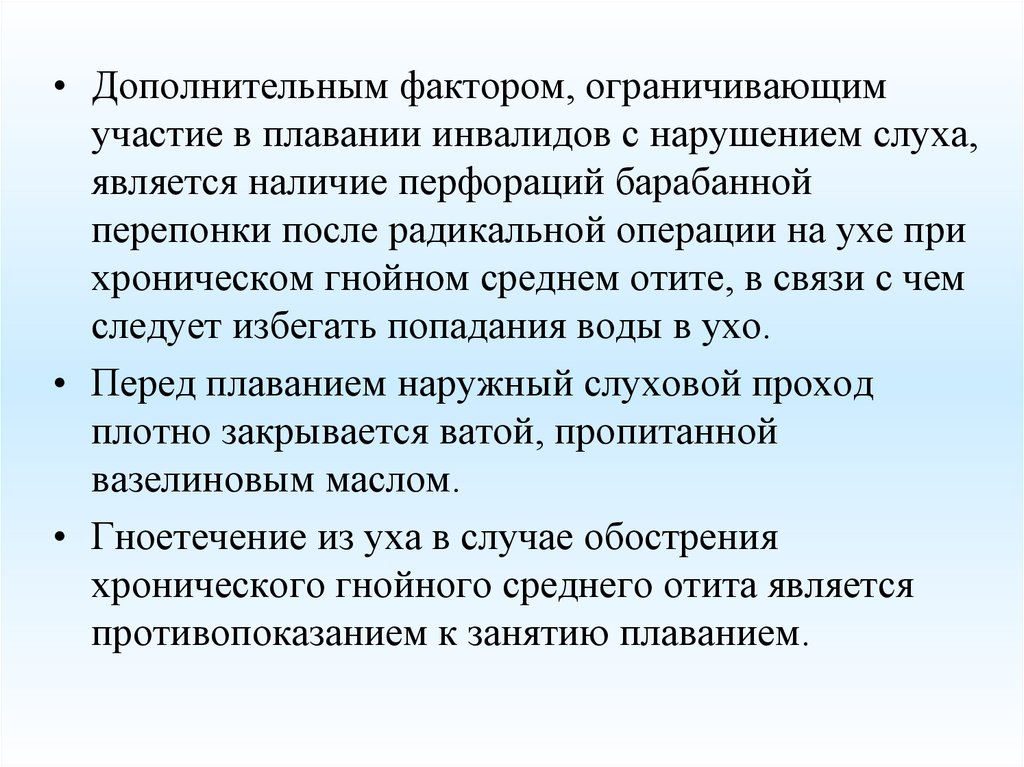 • Дополнительным фактором, ограничивающимучастие в плавании инвалидов с нарушением слуха,