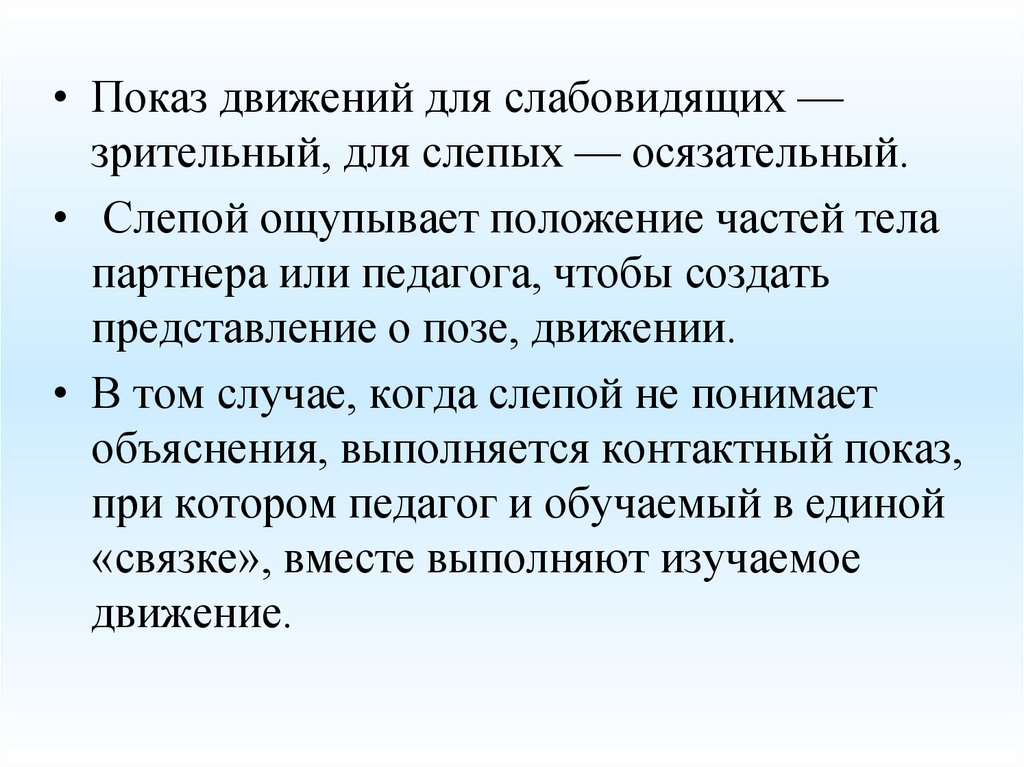 • Показ движений для слабовидящих —зрительный, для слепых — осязательный.