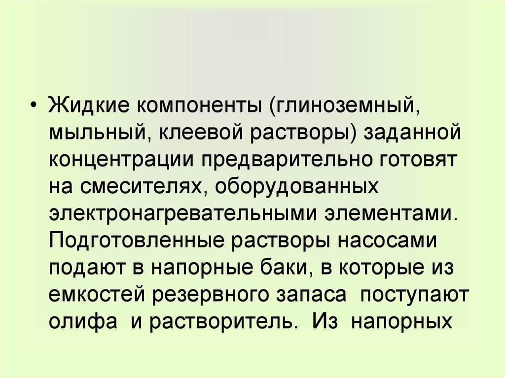 • Жидкие компоненты (глиноземный,мыльный, клеевой растворы) заданной