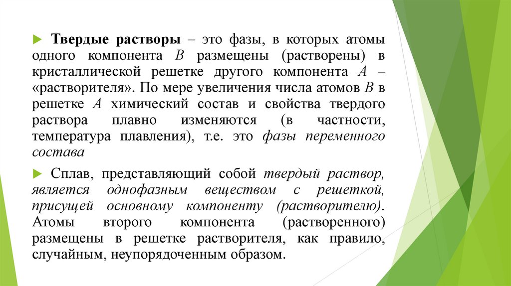 Твердые растворы – это фазы, в которых атомыодного компонента В размещены (растворены) в