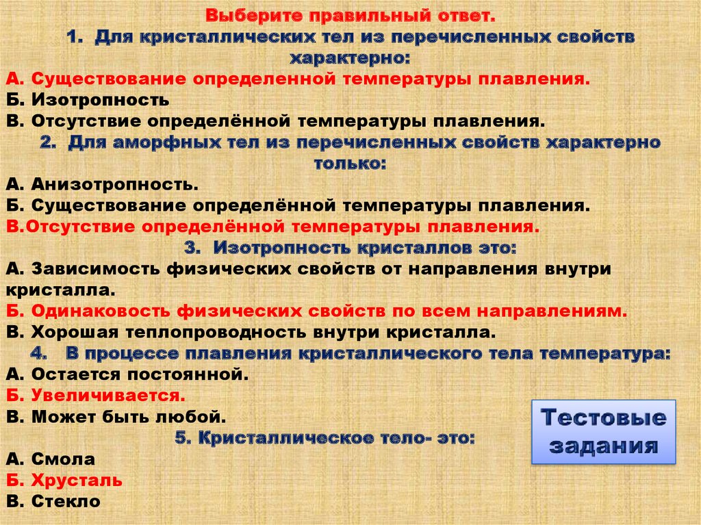 Выберите правильный ответ.1. Для кристаллических тел из перечисленных свойств