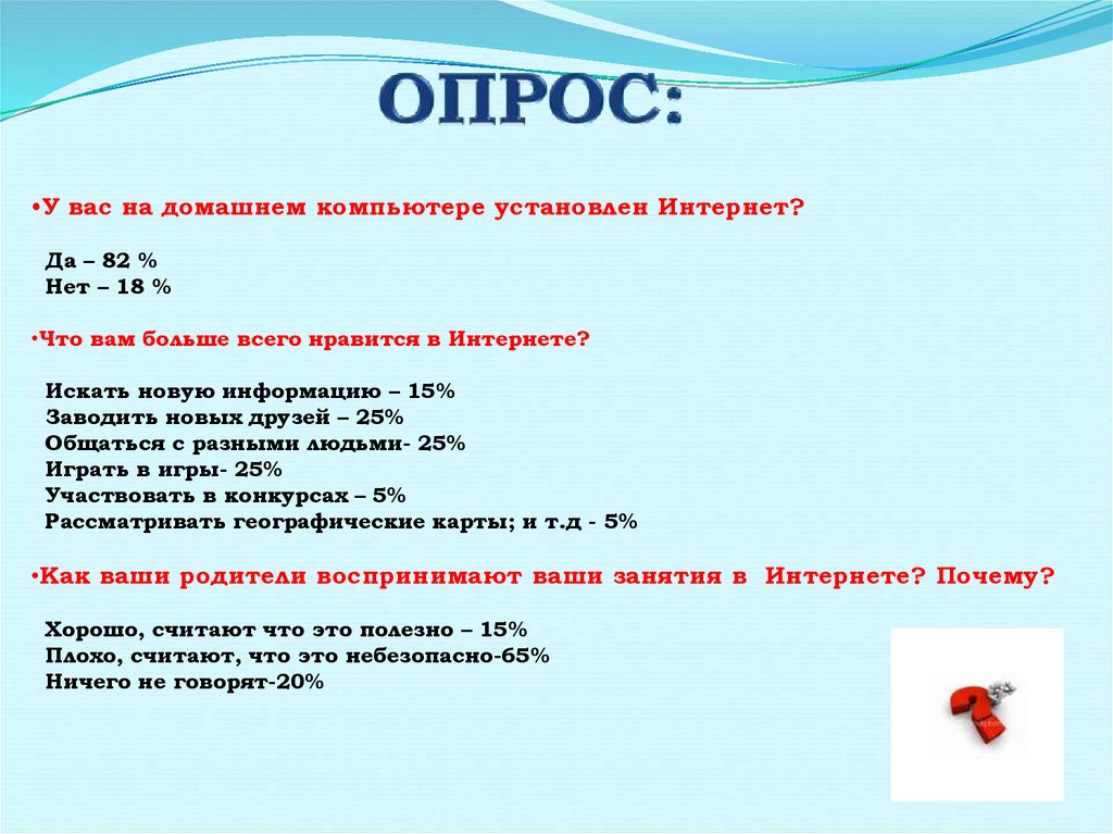 •Как ваши родители воспринимают ваши занятия в Интернете? Почему?