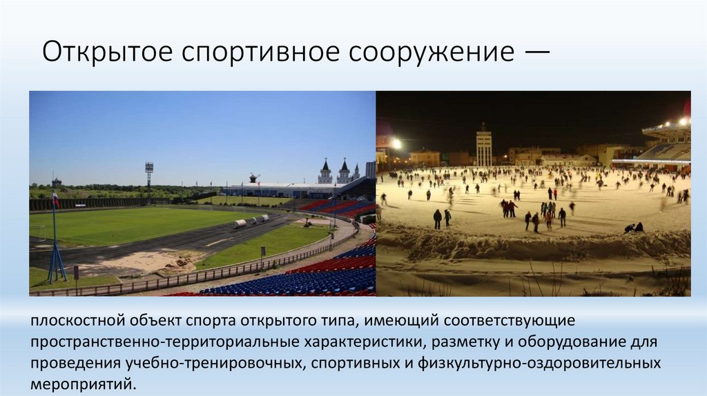 Открытое спортивное сооружение —плоскостной объект спорта открытого типа, имеющий соответствующие