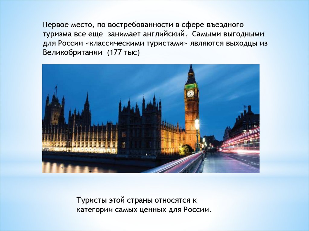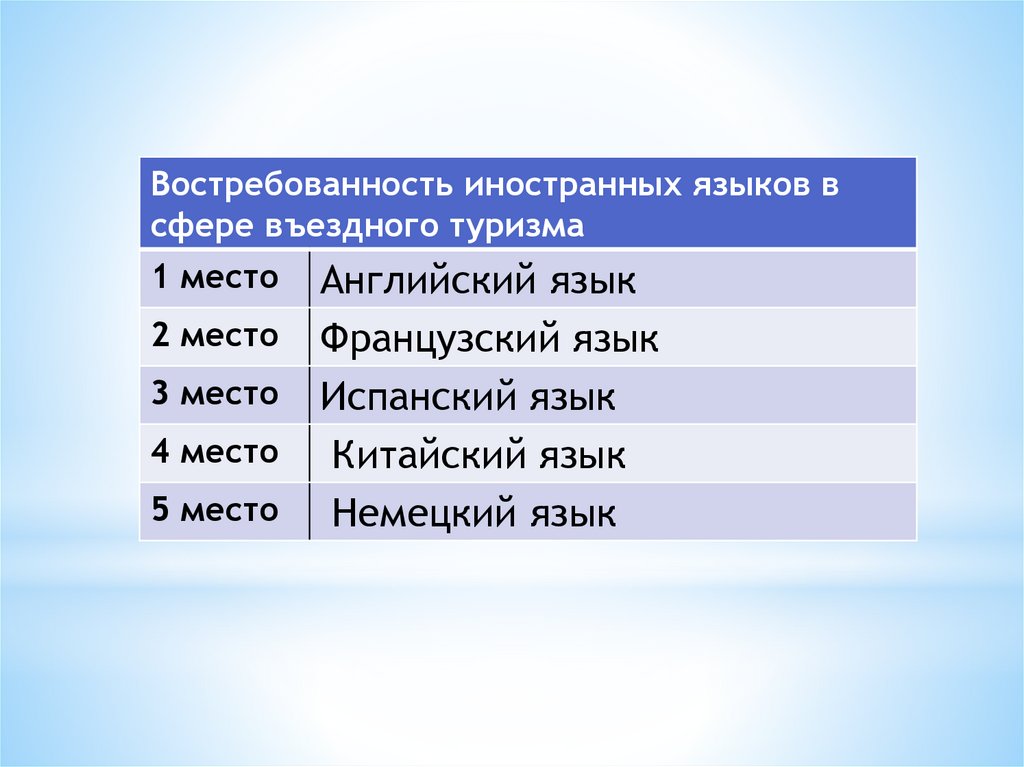 Первое место, по востребованности в сфере въездноготуризма все еще занимает английский. Самыми выгодными