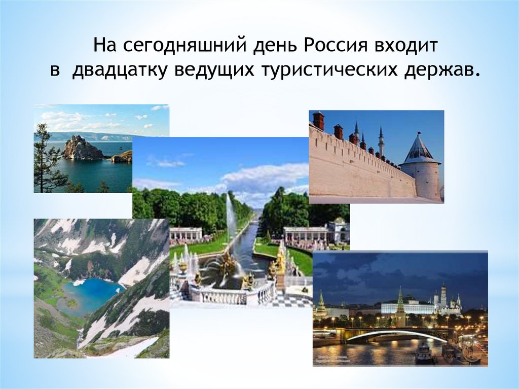 На сегодняшний день Россия входитв двадцатку ведущих туристических держав.
