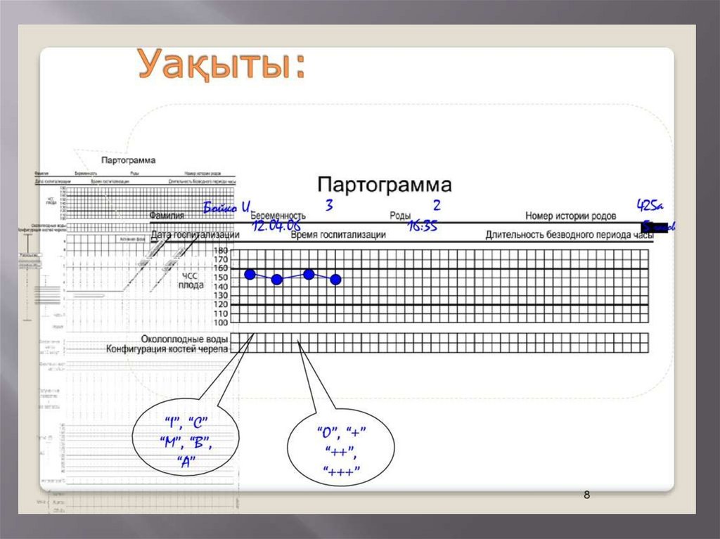 3. Партограмма – жүктілік ағымында ұрықтың жалпы күй жағдайы, ұрықтың қозғалуы мен жатыр мойнының ашылуын графикалық түрде